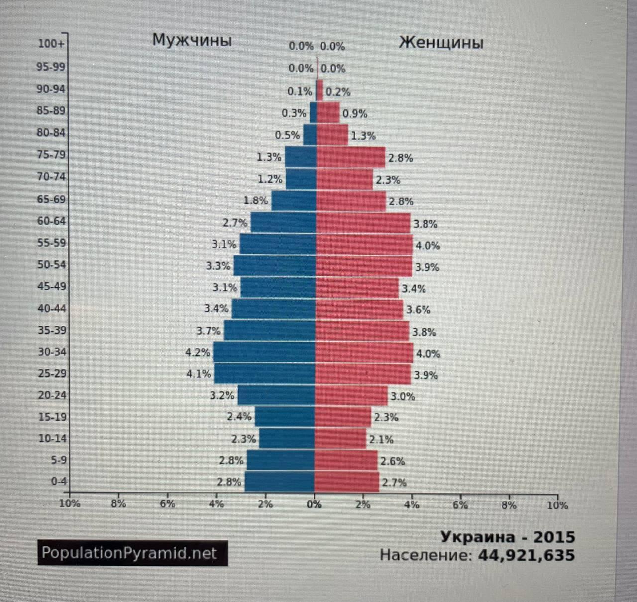 Проанализировав половозрастную пирамиду для Украины ( 2015), выберите верный ответ.