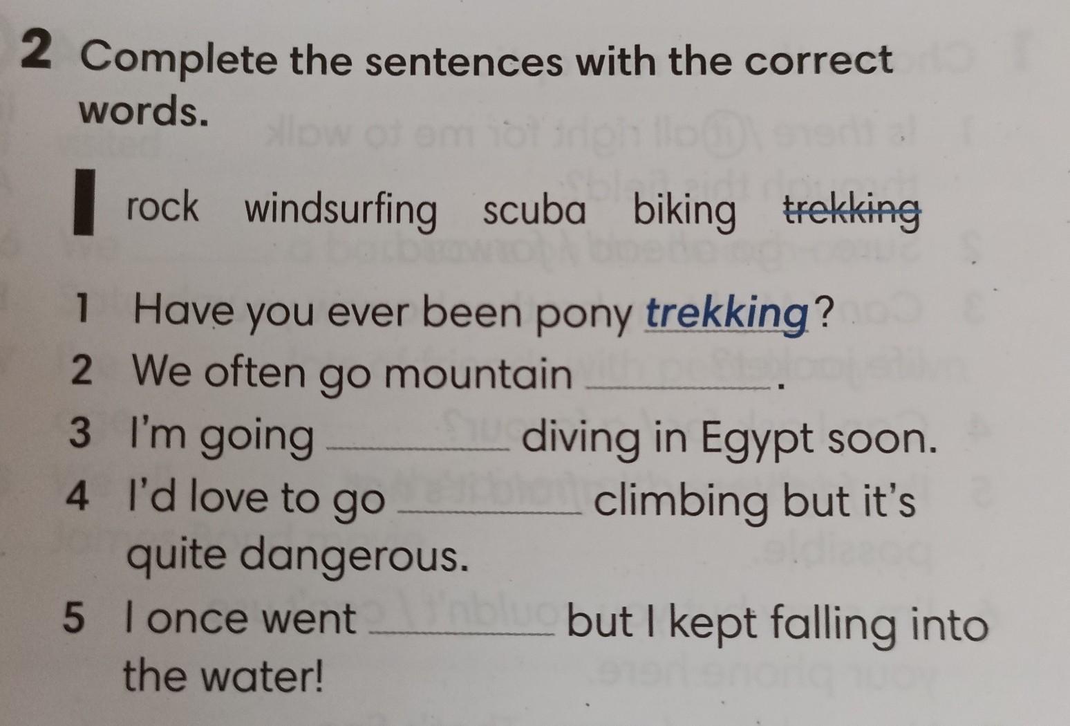 Complete the sentences with the correct words. rock windsurfing scuba biking trekking 1 Have you ever been pony trekking? 2 We often go mountain 3 I'm going diving in Egypt soon. climbing but it's 4 I'd love to go quite dangerous. 5 I once went the water! but I kept falling into