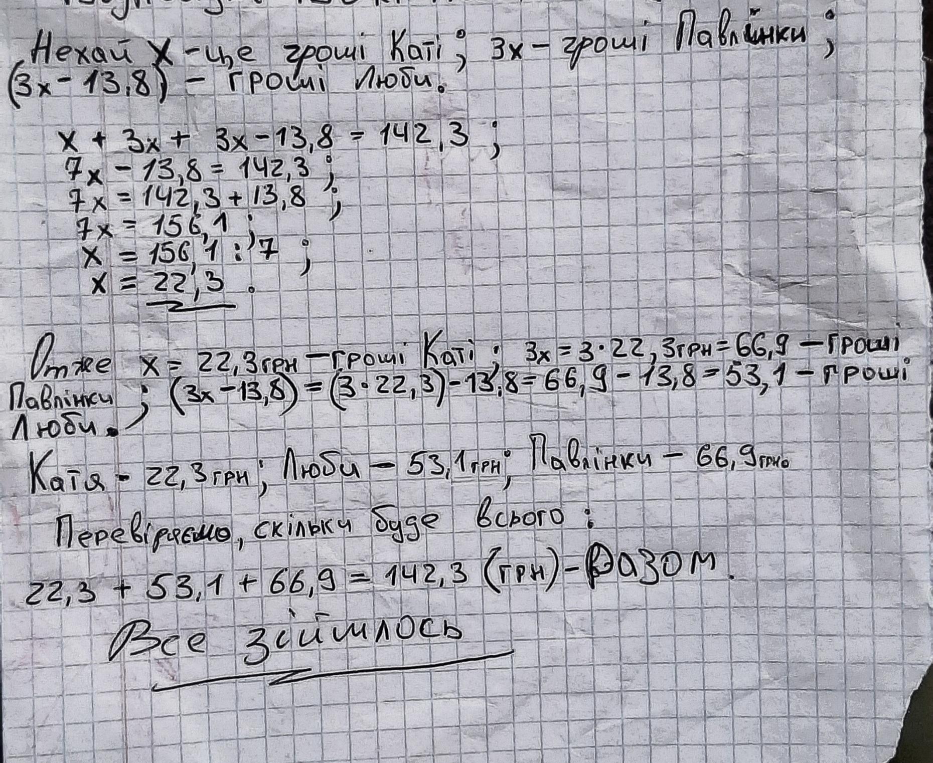 Сестрички Павлінка, Люба і Катя вирішили купити подарунок мамі на День Матері і дістали гроші зі своїх скарбничок. У Павлінки збережень було у 3 рази більше ніж у Каті і на 13,8 грн більше ніж у Люби. Скільки грошей дала кожна сестричка, якщо вартість подарунку становила 142,3 гривень?