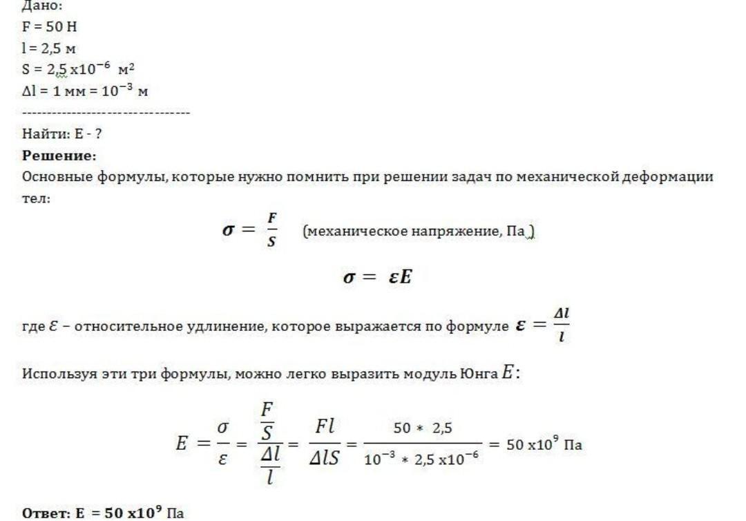 . Під дією сили 50 Н дріт довжиною 2,5 м і площею поперечного перерізу 2,5ꞏ10–6 м2 видовжилася на 1 мм. Визначте модуль Юнга.