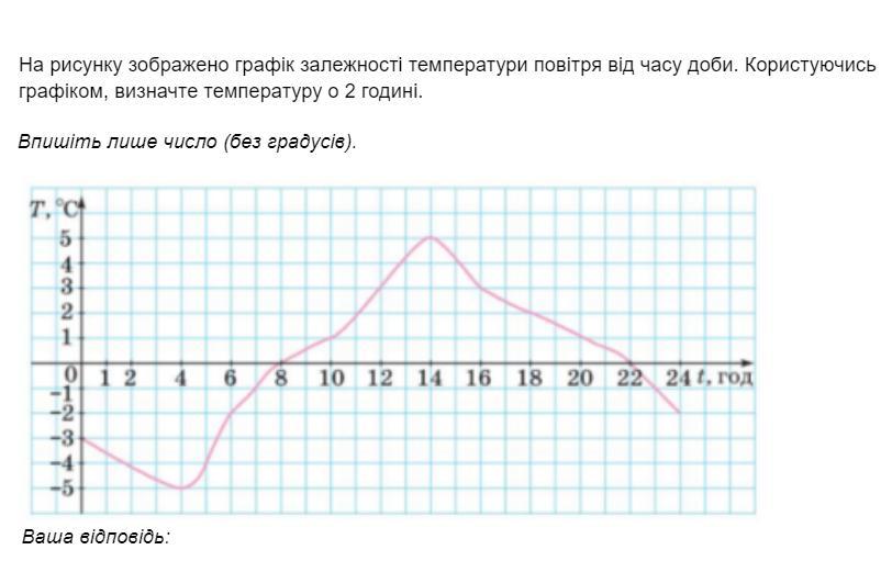На рисунку зображено графік залежності температури повітря від часу доби. Користуючись графіком, визначте температуру о 2 годині.
