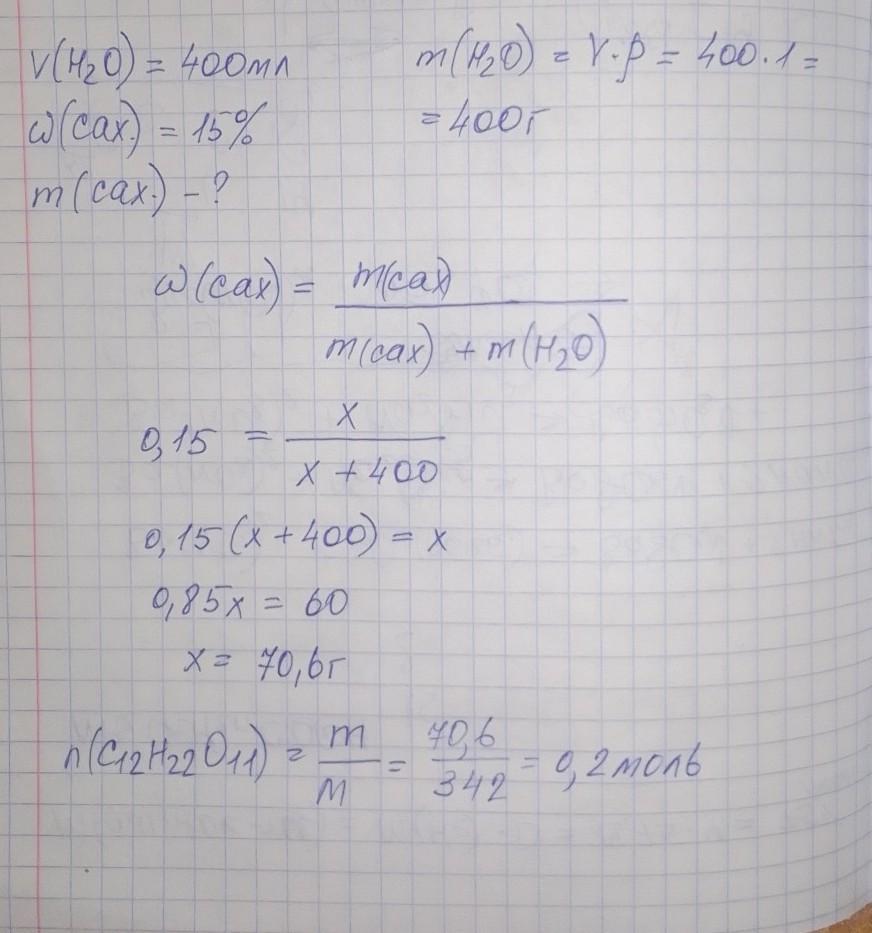 яку кількість речовини сахарози потрібно розчинити у воді об'ємом 400 мл, щоб одержати розчин з масовою часткою сахарози 15 %