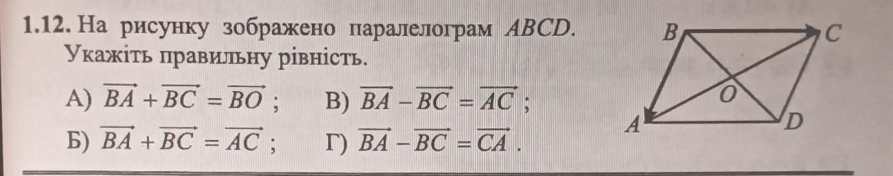 Випадки А) і Б) не підходять, бо сумою векторів ВА і ВС за правилом паралелограмма є вектор ВД (а не вектор ВО, який складає тільки половину потрібного вектора і тим паче не вектор АС, бо умова правила трикутника додавання векторів тут не виконується, треба, щоб кінець першого вектора співпадав з початком другого, а на рисунку у цих векторів спільний початок.