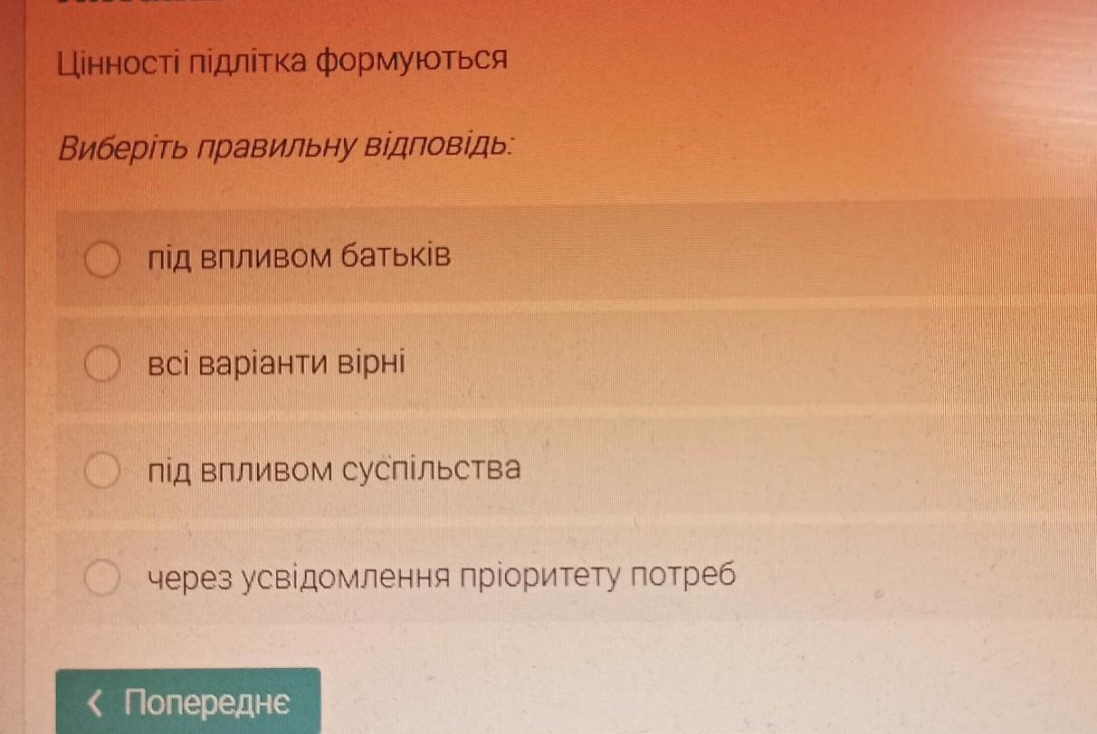 Всі варіанти вірні тому що це все впливає на цінності підлітка