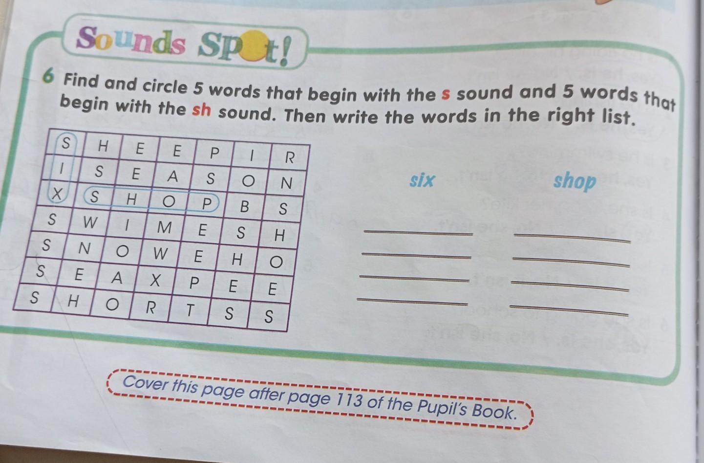 Жаль в своё время не увидела, помогла бы. Sh: short, shorts, shoes, sheep, she. S: season, snow, swim, sea.