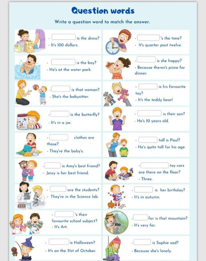 1) how much? 2) where 3) who 4) where 5) whose 6) who 7) where 8) what 9) when 10) what 11) why 12) what 13) how old 14) how 15) how many 16) when 17) how 18) why