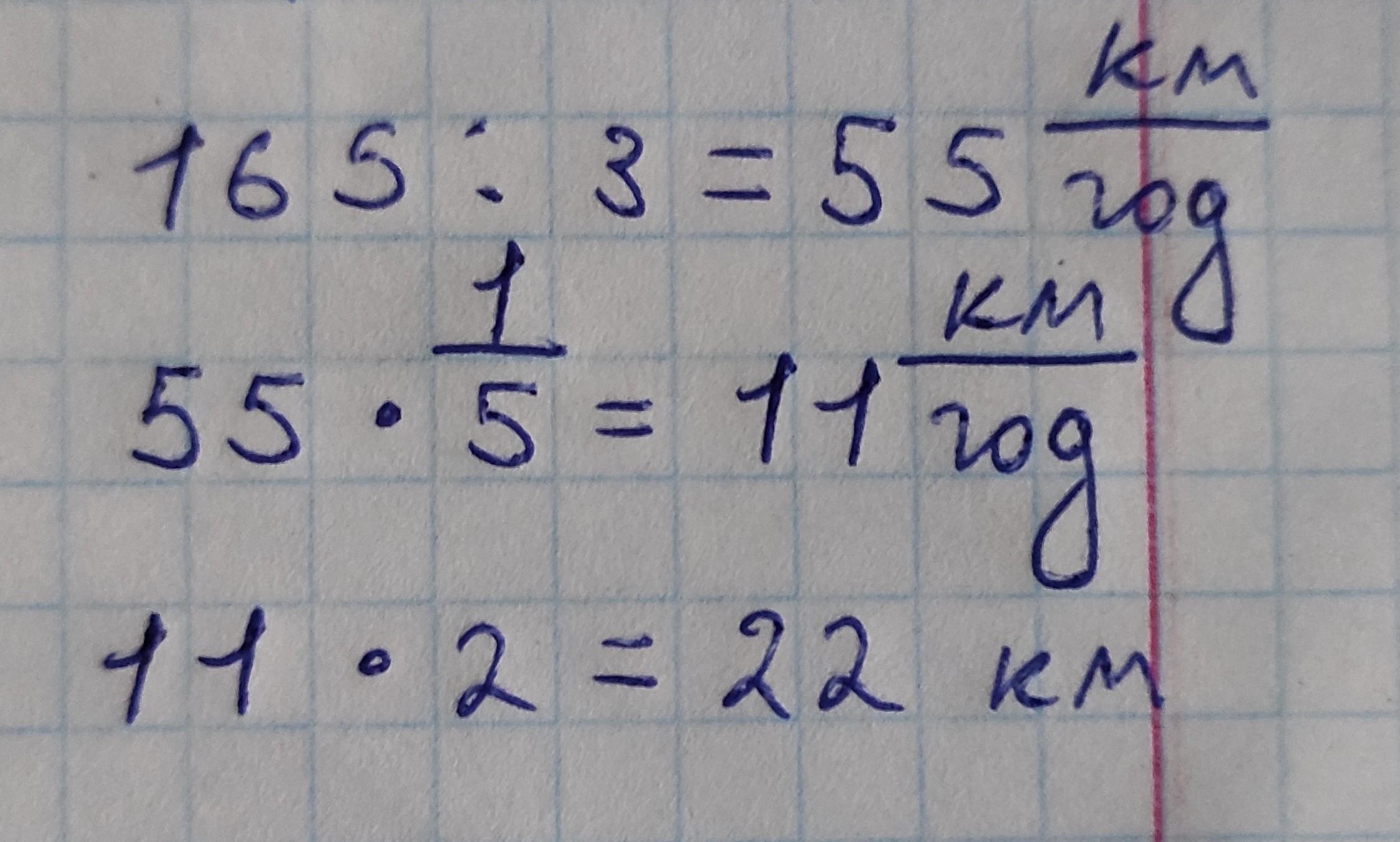 мотоцикліст подолав 165км за 3 години. Швидкість велосепедиста становить пяту частину швидкості мотоцикліста. Яку відстань подолає велосипедист за 2 годин?