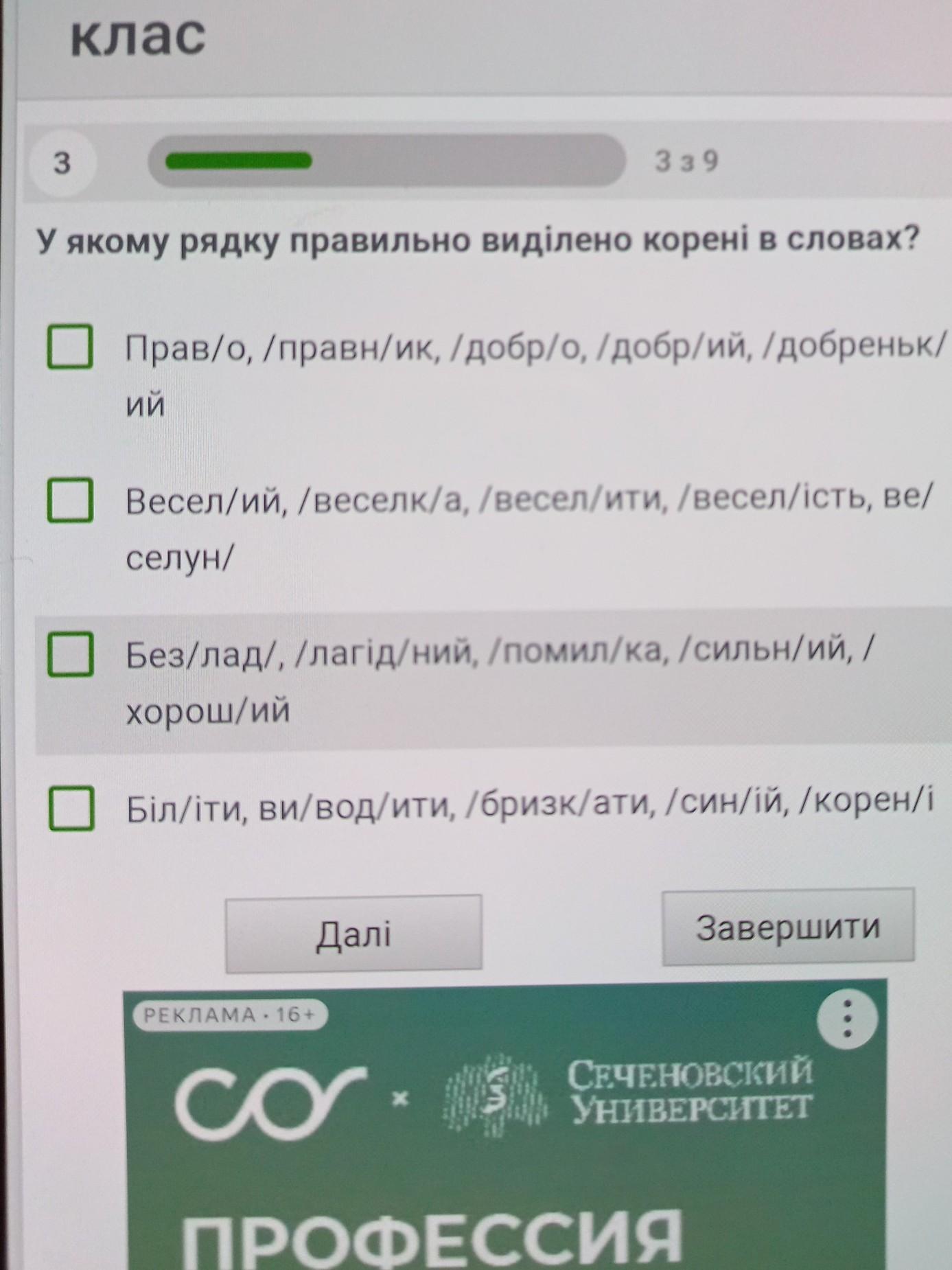 БІЛ/іти, ви/ВОД/ити, БРИЗК/ати, СИН/ій, КОРЕН/і