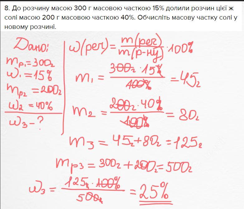 8. До розчину масою 300 г масовою часткою 15% долили розчин цієї ж солі масою 200 г масовою часткою 40%. Обчисліть масову частку солі у новому розчині.