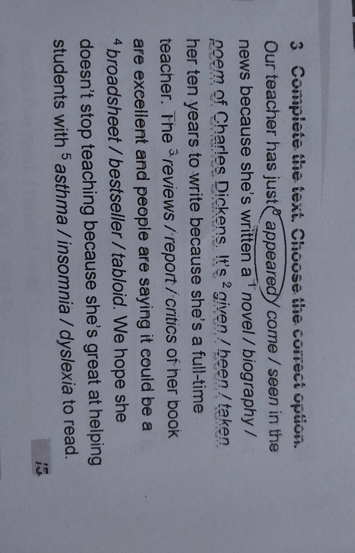 Our teacher has just appeared in the news because she's written a novel of Charles Dickens. It's taken her ten years to write because she's a full-time teacher. The reviews of her book are excellent and people are saying it could be a bestseller. We hope she doesn't stop teaching because she's great at helping students with dyslexia to read.