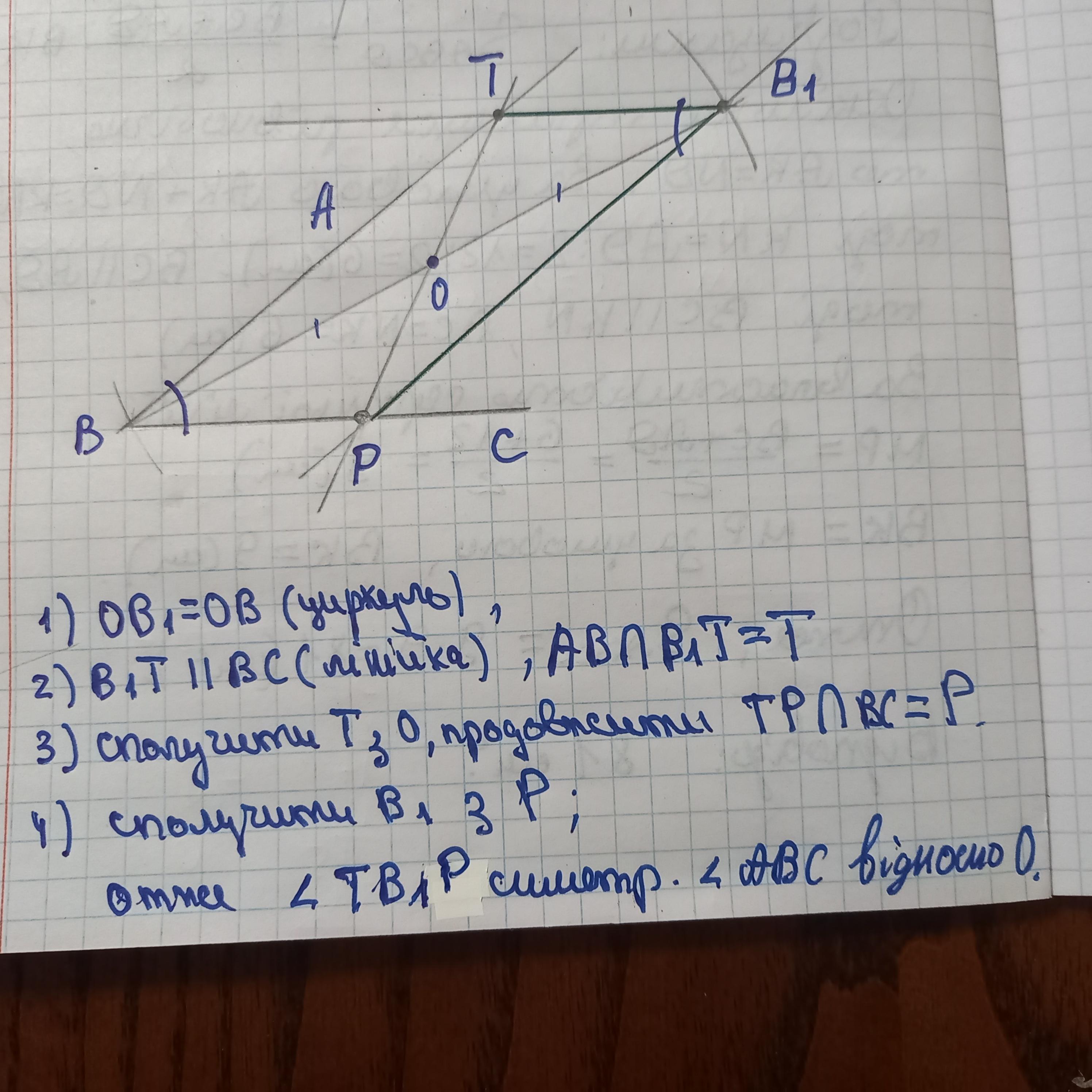 Дано кут АВС і точку О, яка належить куту, але не належить його сторонам. Побудуйте кут, симетричний куту АВС відносно точ- ки О.