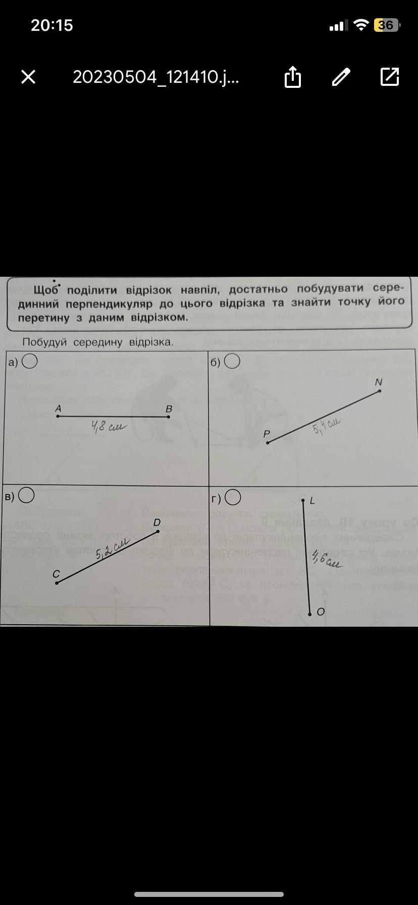 Пояснення: я роблю циркулем, але можна просто поділити довжину відрізкана 2, знайти цю точку і провести через неї лінію косинцем перпендикулярно до відрізка)