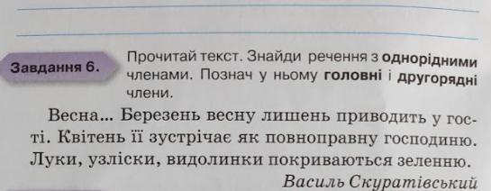 останнє речення , це речення з однорідними членами речення. Головні члени речення: покриваються (він буде присудком) Луки, узліски,видоли5ки іменники тобто підмет другорядні члени речення : зеленню це буде додаток
