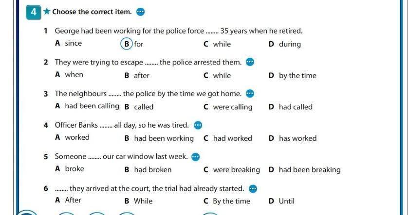 4 Choose the correct item. 1 George had been working for the police force......... 35 years when he retired. A since B) for C while D during 2 They were trying to escape.......... the police arrested them. → A when B after C while 3 The neighbours......... the police by the time we got home. A had been calling B called C were calling 4 Officer Banks........ all day, so he was tired. A worked B had been working C had worked 5 Someone.........our car window last week... A broke B had broken D by the time. 6........ they arrived at the court, the trial had already started. A After B While C By the time D had called D has worked C were breaking D had been breaking D Until