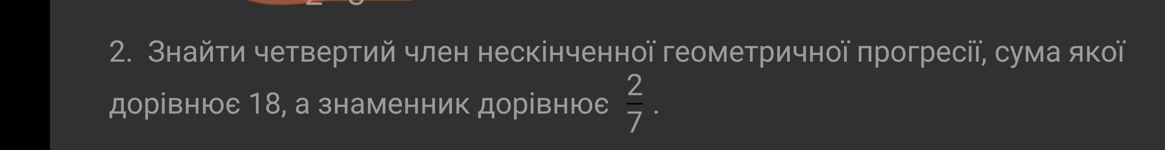 ДАЮ 70 БАЛОВ!!!! Знайти четвертий член нескінченної геометричної прогресії, сума якої 2 дорівнює 18, а знаменник дорівнює 2/7
