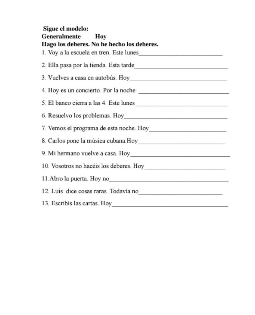 1. Voy a la escuela en tren. Este lunes. - Voy a la escuela en tren. Hoy no.