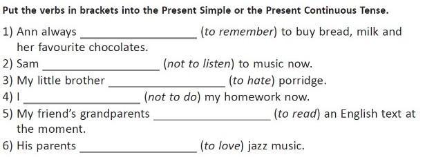 1) Ann always remembers to buy bread, milk and her favourite chocolates.
