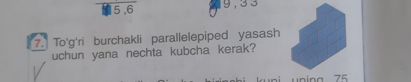 Shu sababli, bu parallelepipedni yasash uchun 4x3x5=60 ta kubcha ke