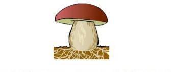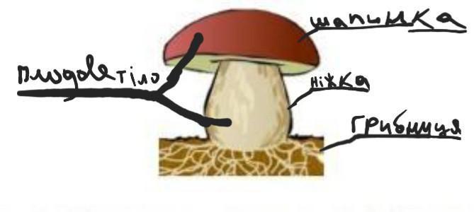 6. Замалюйте шапинковий гриб, позначивши на рисунку плодове тіло, шапинку, нiжку, грибницю (міцелій)