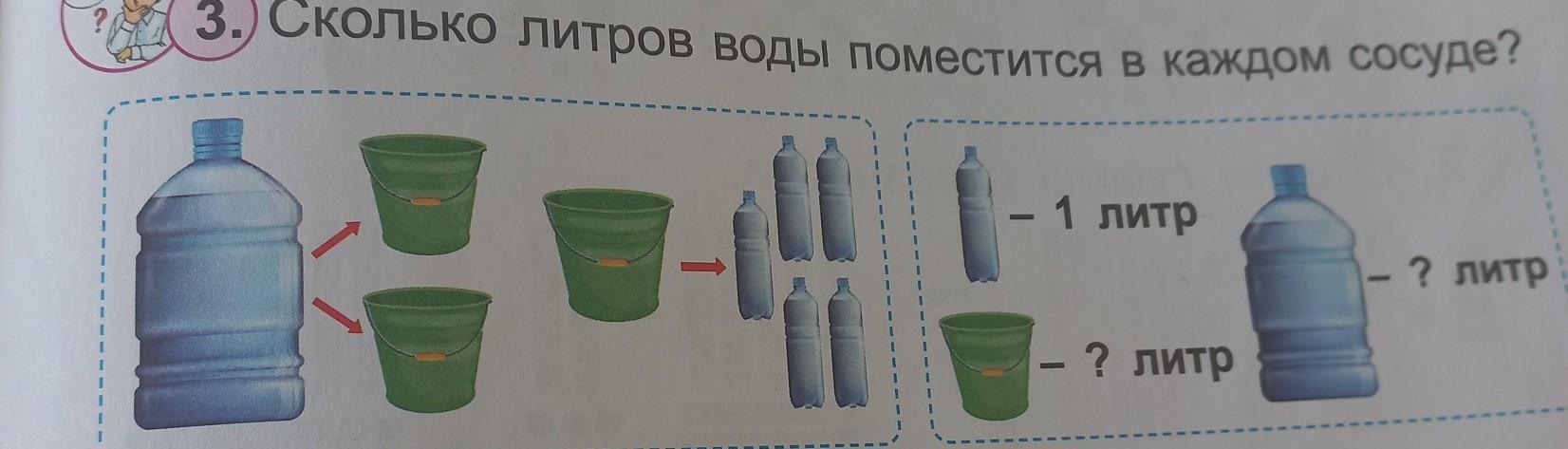 Зеленое ведро = 5 маленьких бутылок = 5*1 литр = 5 литров