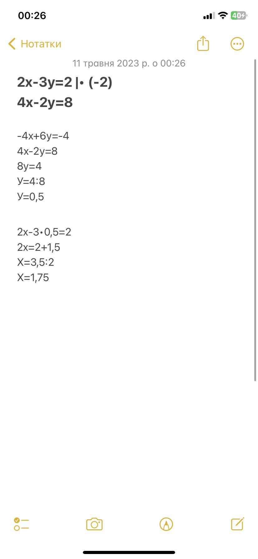 2х-3у=2 |• (-2)4х-2у=8 -4х+6у=-44х-2у=8 8у=4У=4:8У=0,52х-3•0,5=22х=2+1,5Х=3,5:2Х=1,75