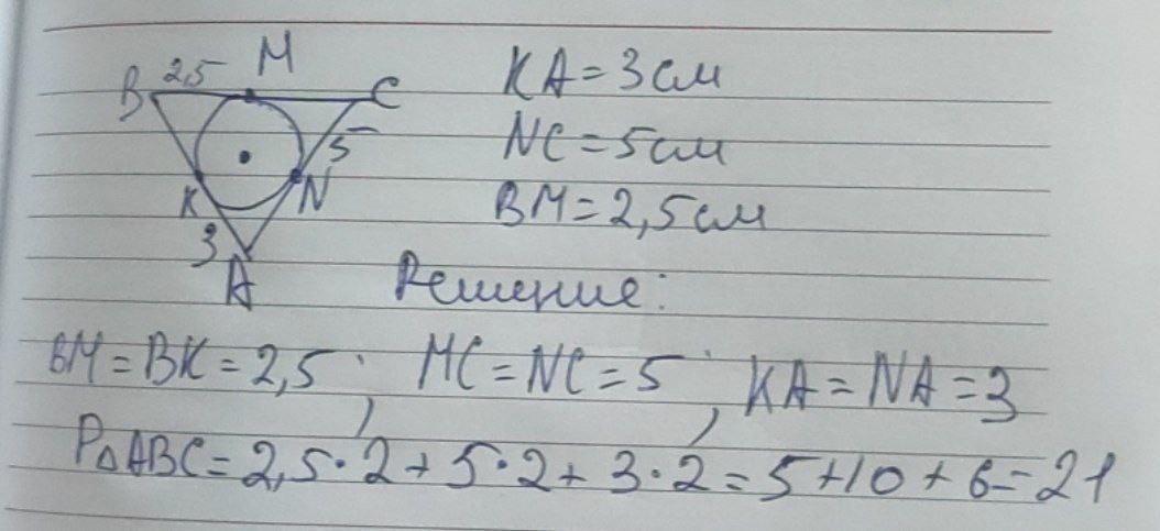9. Знайдіть периметр трикутника ABC. Якщо KA-3CM, NC-5CM, BM-2,5CM.