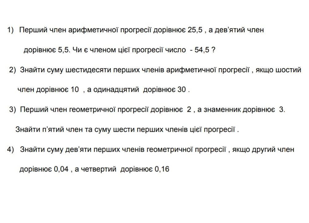 1) Перший член арифметичної прогресії дорівнює 25,5 , а дев'ятий член дорівнює 5,5. Чи є членом цієї прогресії число - 54,5 ? 2) Знайти суму шестидесяти перших членів арифметичної прогресії, якщо шостий член дорівнює 10 , а одинадцятий дорівнює 30 . 3) Перший член геометричної прогресії дорівнює 2, а знаменник дорівнює 3. Знайти п'ятий член та суму шести перших членів цієї прогресії . 4) Знайти суму дев'яти перших членів геометричної прогресії, якщо другий член дорівнює 0,04 , а четвертий дорівнює 0,16