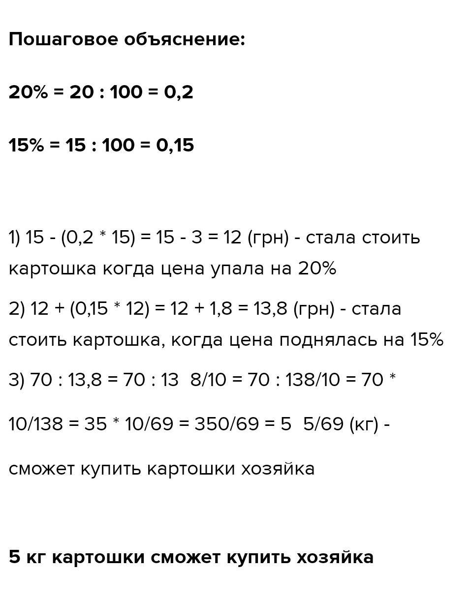 Господиня вирішила купити картоплю і взяла 70грн.. Вона знала, що восени картопля коштувала 15 грн., але потім ціна впала на 20%. Перед святами ціна піднялася на 15%. Якою стала ціна картоплі і скільки кілограм зможе купити господиня?