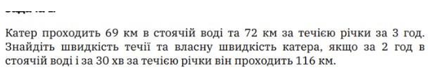 Швидкість течії річки: 6 км/год. Власна швидкість катера: 27 км/год.