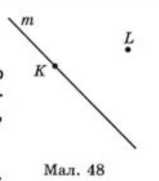 Накресли пряму м та точки к i L, як показано на малюнку 48. За допомогою косинця побудуй пряму,KA, перпендикулярну до прямої м, та пряму LB, перпендикулярну до прямої м.