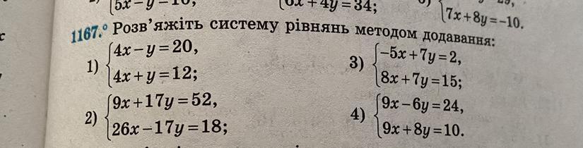1167.° Розв'яжіть систему рівнянь методом додавання:
