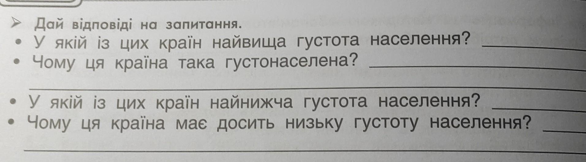 Урок 5 Домашнє завдання - Дай вiдповіді на запитання. • У якiй iз цих краïн найвища густота населення? Чому ця країна така густонаселена? • У якiй iз цих краïн найнижча густота населення? Чому ця країна має досить низьку густоту населення? 3. Розглянь фрагмент карти густоти населення світу. На зображеній території мешк бiльше людей, ніж на решті суходолу.