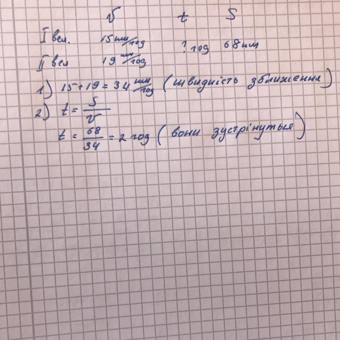 З двох міст, відстань між якими 68 км, одночасно назустріч один одному виїхало два велосипедисти зі швидкостями 15 км/год і 19 км/год. Через який час вони зустрінуться? нужно столбком