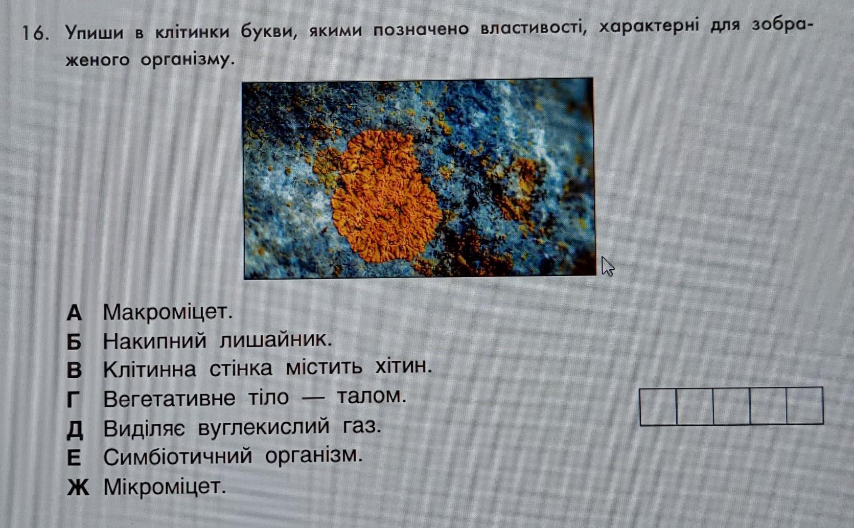 16. Упиши клітинки букви, якими позначено властивості, характерні для зобра- женого організму. А Макроміцет. Б Накипний лишайник. в Клітинна стінка містить хітин. Вегетативне тіло талом. Д Виділяє вуглекислий газ. E Симбіотичний організм. Ж Мікроміцет.