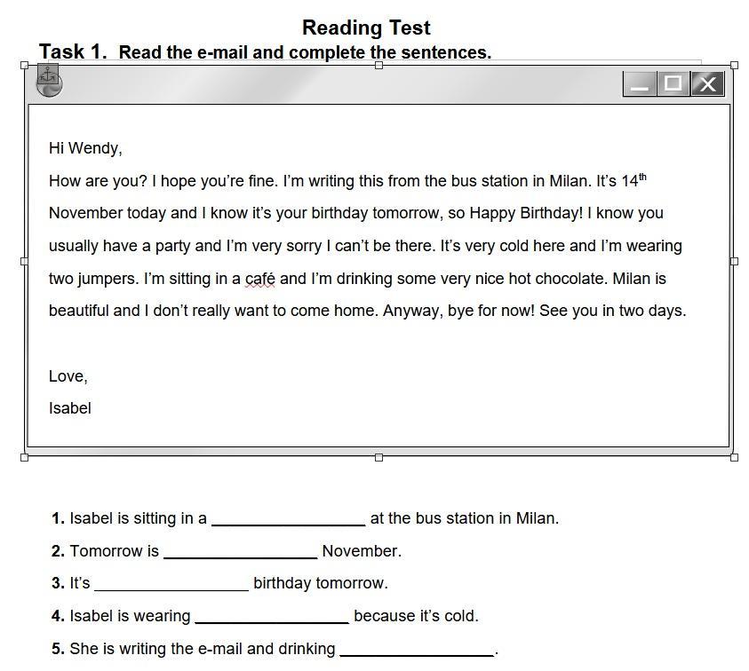 Task1: 1)càfe 2)15 3)your 4) two jumpers 5) very nica hot chocolate