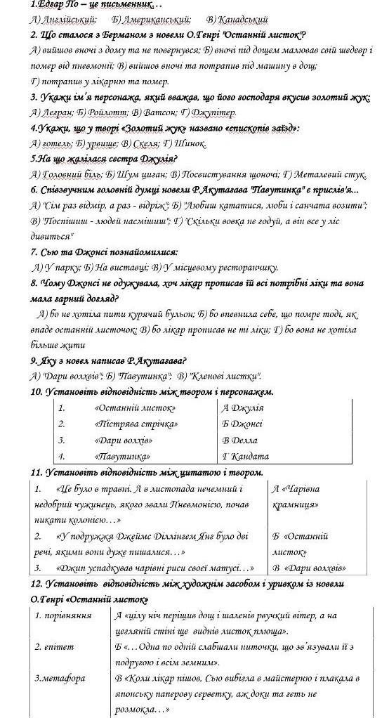 1.Едгар По-це письменник... A) Англійський; Б) Американський; В) Канадський 2. що сталося з Берманом з новели О.Генрi Останній листокр А) вийшов вночі з дому та не повернувся; Б) вночі під дощем малював свiй шедевр і помер від пневмонії; В) вийшов вночі та потрапив під машину в дощ: T) потрапив у лікарню та помер. 3. Укажи iм'я персонажа, який вважав, що його господаря вкусив золотий жук: А) Легран: Б) Ройломм; В) Ватсон; Г) Фжупітер. 4.Укажи, що у творі «Золотий жук названо кепископів заїзд»: A) гомель: Б) урвище: В) Скеля; Г) Шинок 5.На що жалілася сестра Джулія? А) Головний біль; Б) Шум циган; В) Посвистування щоночі; Г) Металевий стук- 6. Співзвучним головній думці новели Р.Акутагава Павутинка" е прислів'я... А) Сiм раз відмір, а раз - вiдрiж" Б) "Любиш кататися, люби і санчата возити" В) 'Поспішиш - людей насмiшиш", Г) Скільки вовка пе годуй, а він все у ліс дивиться" 7. Сью та Джонсi познайомилися: л) У парку; Б) На виставці; В) У місцевому ресторанчику. 8. Чому Джонсi не одужувала, хоч лiкар прописав ïï всi nomрібні ліки мала гарний догляд? А) бо не хотіла пити курячий бульон; Б) бо впевнила себе, що помре тоді, як впаде останній листочок; В) бо лiкар прописав не тi лiкц; Г) Бо вона не хотіла бiльше жumu 9. Яку з новел написав Р.Акутагава? А) "Дари волхвів", Б) "Павутинка", В) "Кленові листки" 10. Установіть вiдповiднiсть мiж твором і персонажем. 1. A DAuir 2. Б Джонсi 3. B Dexxa 4. «Павутинка» Т Кандама 11. Установіть вiдповiднiсть мiж цимамою i твором. 1. «Це було в травні. Я в листопада нечемний і недобрий чужинець, якого звали Пневмонісю, почав никами колонією...>> О.Генрi «Останній листок 1. порiвняння 2. enimem «Останній листок «Пістрява стрічка «Дари водiв>> 2. «Y nodpykers Джеймс Філлінгем Янг було дві речі, якими вони дуже пишалися... листоку 3. «Dun yenadryBaв чарівні риси своєї матусi...>> В «Дари волхвian 12. Установіть вiдповiднiсть мiж художнiм засобом і уривком із новели 3.метафора 4. Символ A «Чарiвна крамницях Вона Б «Останнiū A «цiny Hiч nepiwив дощ і шаленів рвучкий вітер, а на цегляній стіні ще виднiв листок плющая. Б .... Одна по одній слабшали ниточки, що зв'язували її з подругою і всім земнимо. В «Коли лікар пішов, Сью вибігла в майстерню і плакала в японську паперову серветку, аж доки та геть не розмокда...>> Т... Блда й непорушна, мов повалена статуя». D >