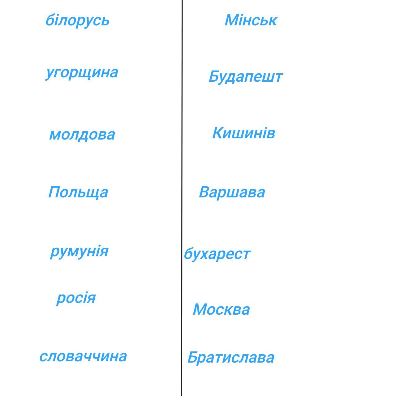 3. Зробити таблицю із 2х колонок, де перша: НАЗВА КРАÏНи з якою межує Україна, а друга столиця країни. (загалом 7 країн)