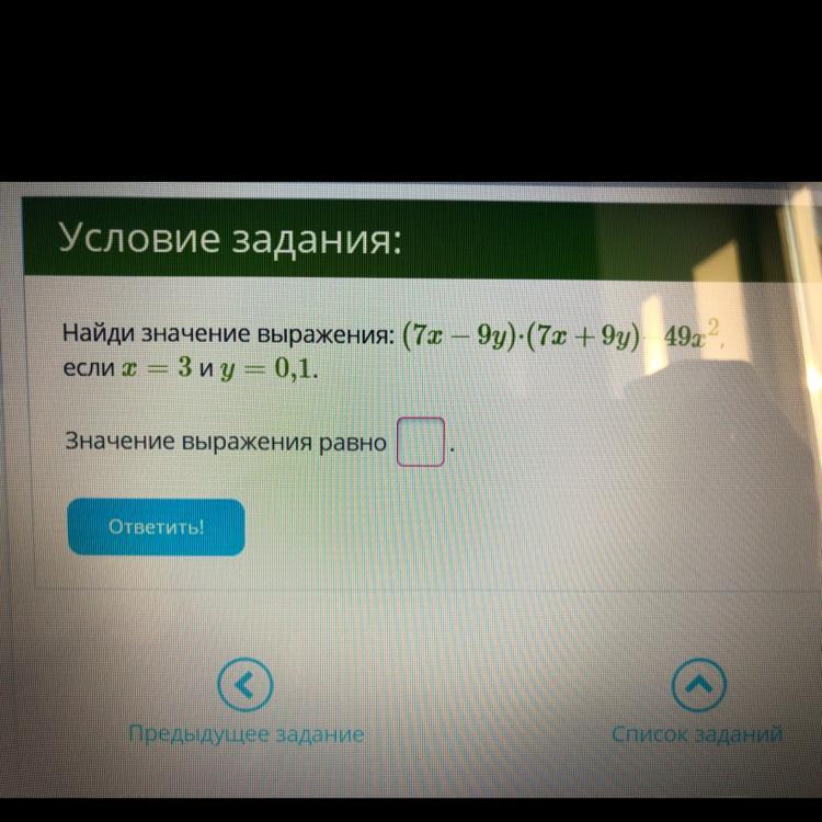 Найди значение выражения: (7x - 9y)-(7x + 9y)-49x2,