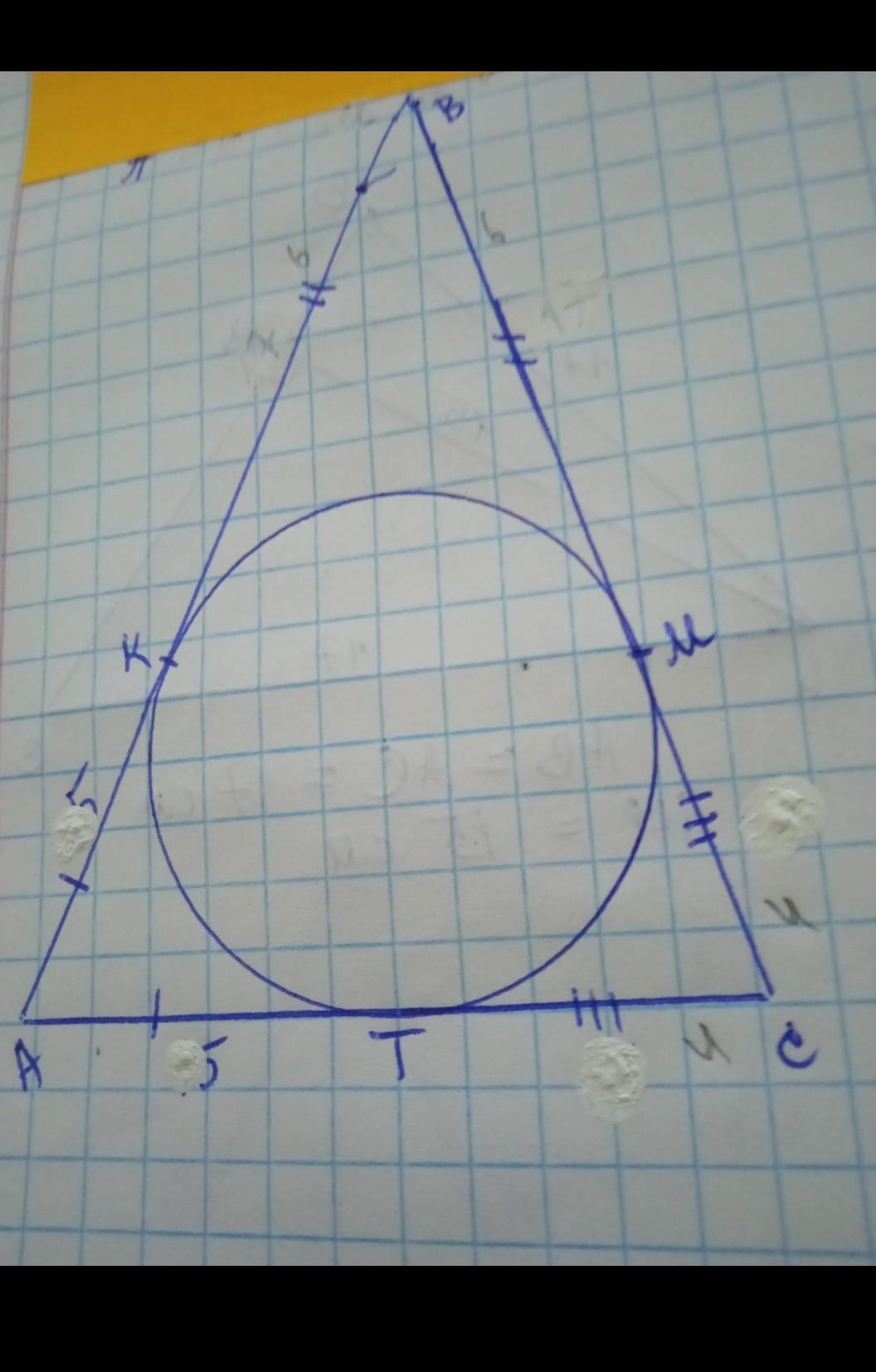 Відрізки дотичних, проведені до кола з днієї точки, рівні між собою. СМ=СТ=4 см, АК=AT=5 CM, BK-BM-6 CM.