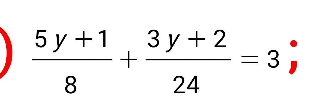 \frac{5y + 1}{8}  +  \frac{3y + 2}{24}  = 3 \:  \:  |  \times 24 \\ 3(5y + 1) + 3y + 2 = 72 \\ 15y + 3 +3 y + 2 = 72 \\ 18y = 72 - 5 \\ 18y = 67 \\ y =  \frac{67}{18}  \\ y = 3 \frac{13}{18}