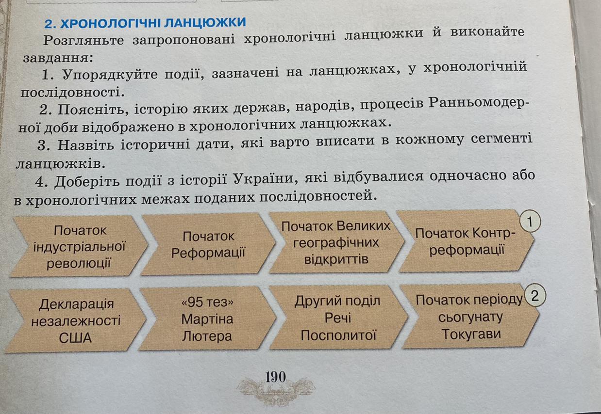 2. Поясніть, історію яких держав, народів, процесів Ранньомодерної доби відображено в хронологічних ланцюжках.