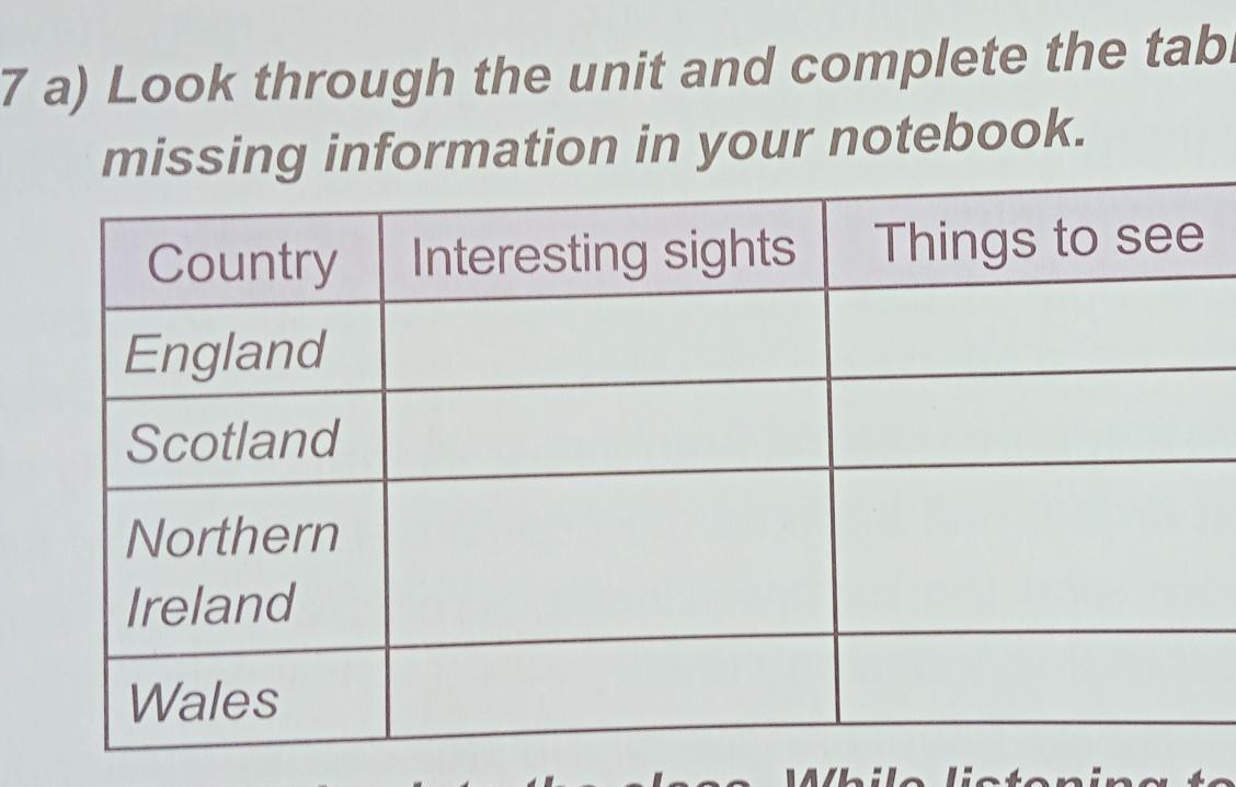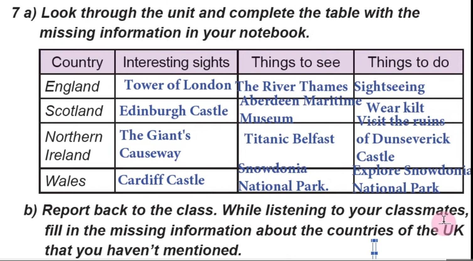 7 a) Look through the unit and complete the table with the missing information in your notebook. Country Interesting sights Things to see England Scotland Northern Ireland Wales Things to do