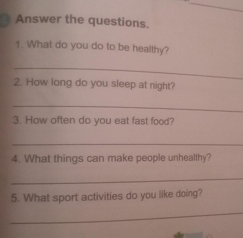 Answer the questions. 1. What do you do to be healthy? 2. How long do you sleep at night? 3. How often do you eat fast food? 4. What things can make people unhealthy? 5. What sport activities do you like doing?
