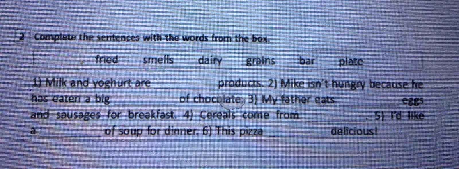 2 Complete the sentences with the words from the box. fried smells 1) Milk and yoghurt are has eaten a big dairy grains bar plate F products. 2) Mike isn't hungry because he of chocolate, 3) My father eats and sausages for breakfast. 4) Cereals come from of soup for dinner. 6) This pizza eggs 5) I'd like delicious! помогите срочно пожалуйста на єто задание 5 мин