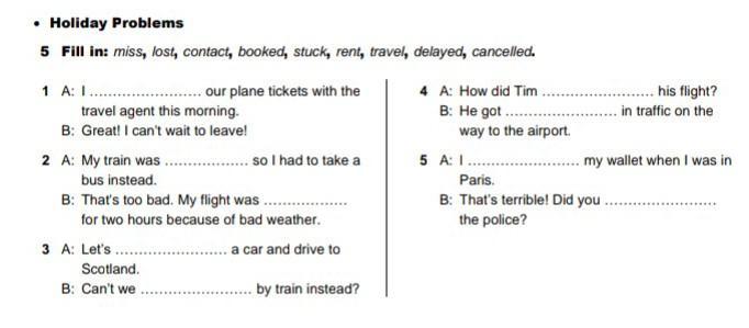 1 A: I our plane tickets with the 4 A: How did Tim. B: He got travel agent this morning. B: Great! I can't wait to leave! 2 A: My train was. .............. so I had to take a bus instead. B: That's too bad. My flight was.. for two hours because of bad weather. a car and drive to 3 A: Let's. Scotland. B: Can't we by train instead? way to the airport. 5 A: I his flight? in traffic on the my wallet when I was in Paris. B: That's terrible! Did you the police?