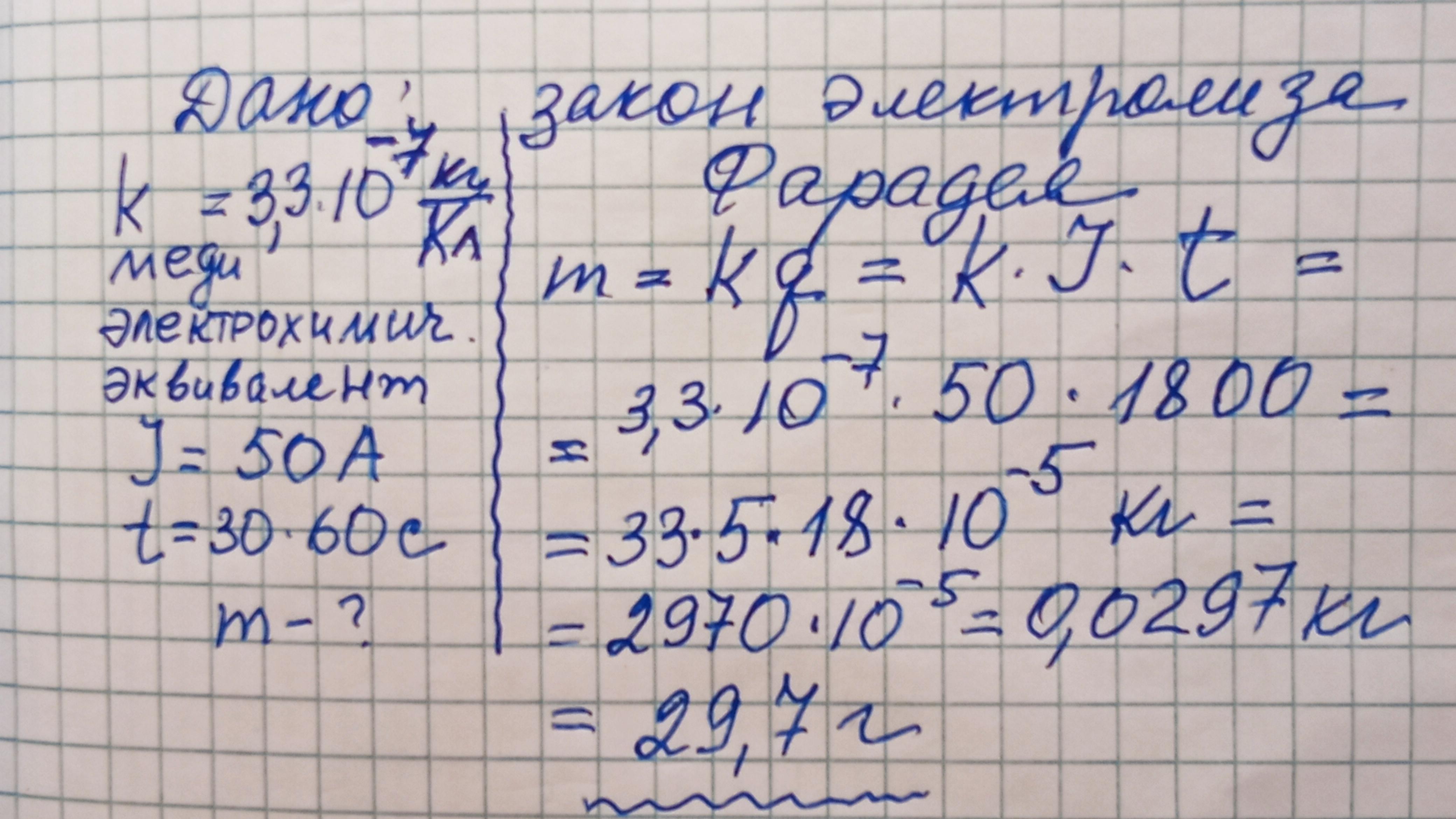 покривання деталі міддю тривало 30хв при силі струму 50А яка маса міді використана в розв'язку повному