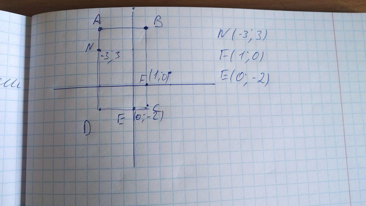 Накресліть на координатній площині прямокутник ABCD, якщо A(-3;5), B(1;5), C(1;-2), D(-3;-2). Познач- те на стороні AD точку N, ордината якої дорівнює 3. За- пишіть координати: 1) точки перетину сторони ВС з віссю абсцис; 2) точки перетину сторони CD з віссю 3) точки N. ординат; y