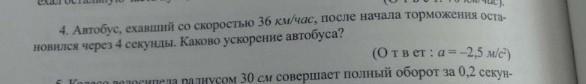4. Автобус, ехавший со скоростью 36 км/час, после начала торможения ос новился через 4 секунды. Каково ускорение автобуса?