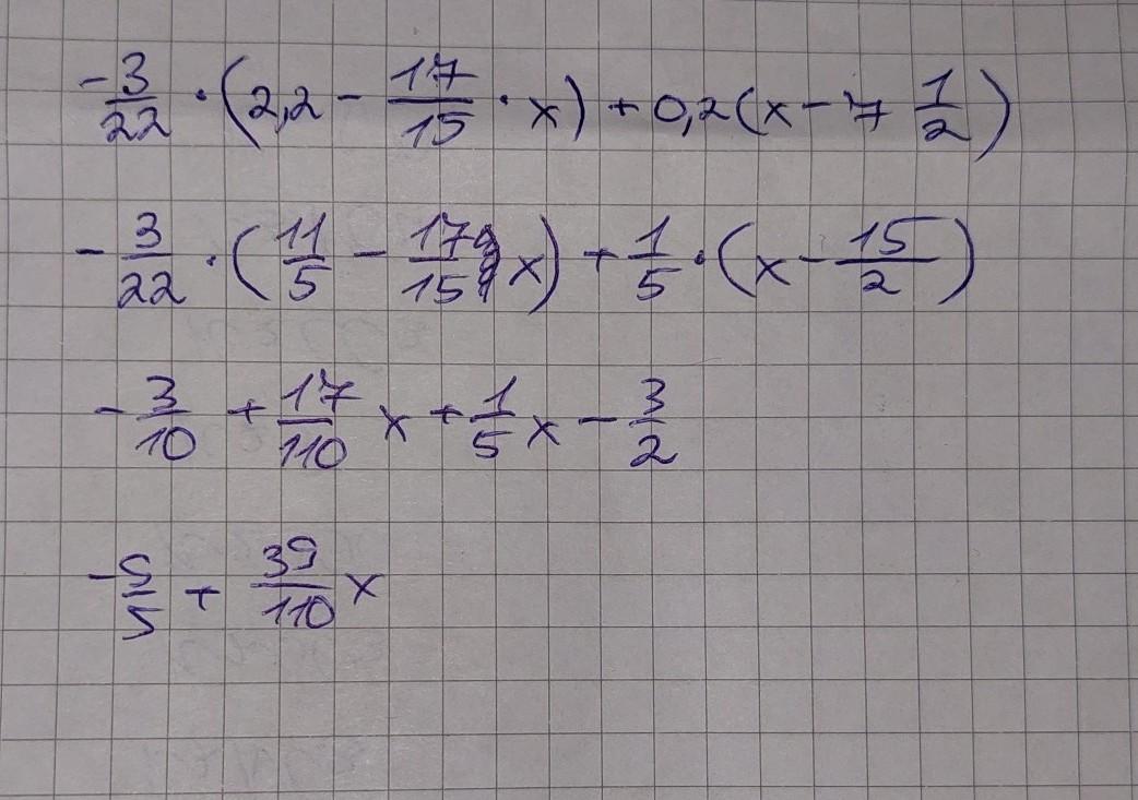 Доведи, що значення виразу - 3/22 * (2, 2 - 1 7/15 * x) + 0, 2(x - 7 1/2) не залежить від значення змінної.