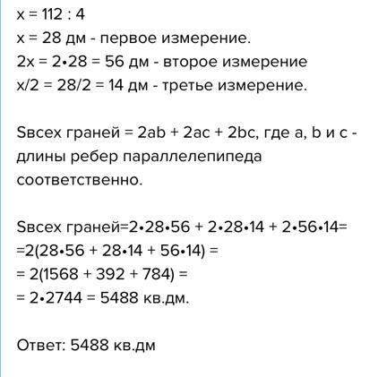 9 б) Найдите сумму площадей всех граней прямоугольного параллелепипеда, если общая длина его рёбер равна 112 дм, одно из измерений в 2 раза меньше другого и в 2 раза больше третьего. сделайте в 1 действие